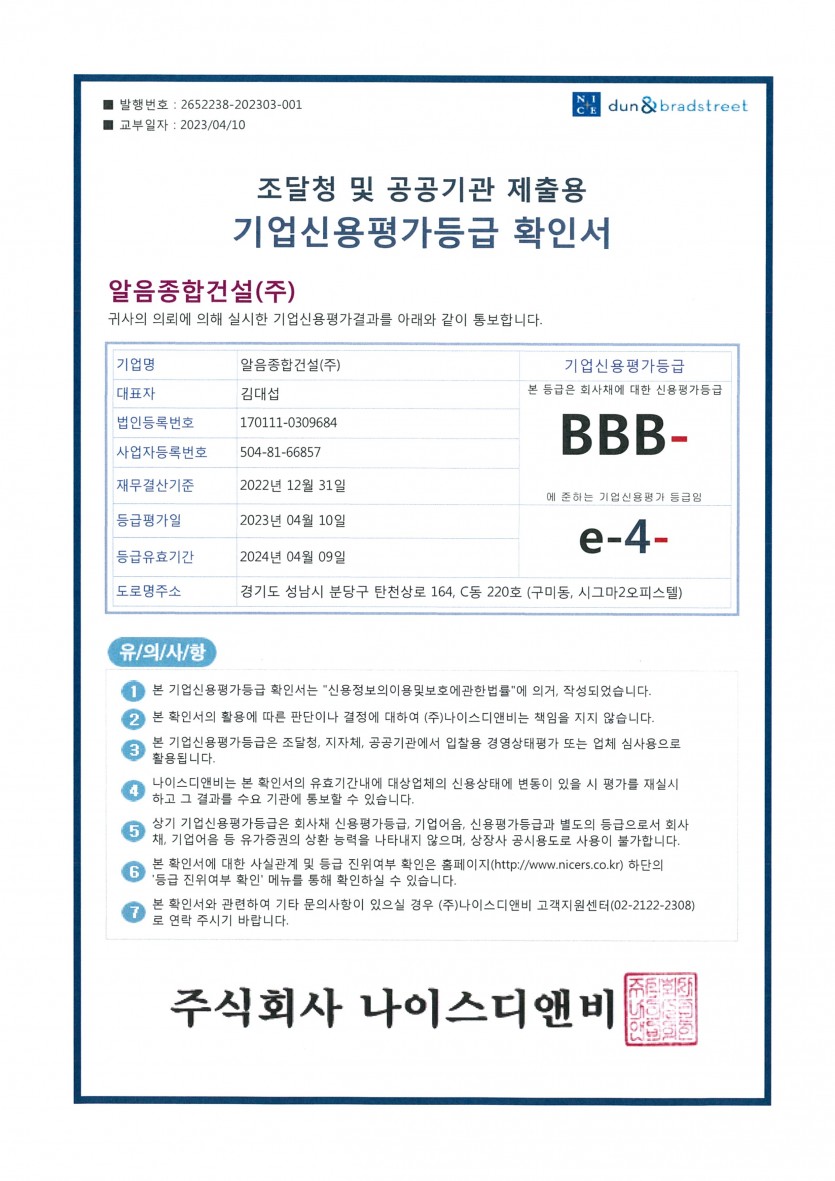 신용등급확인서 페이지 정보 작성자 알음종합건설 댓글 0건 조회 545회 작성일 22-04-18 12:54 목록 본문 알음종합건설(주) 신용등급확인서 입니다. 이전글노원구청장 표창장 23.11.03 다음글사업자등록증 22.04.18