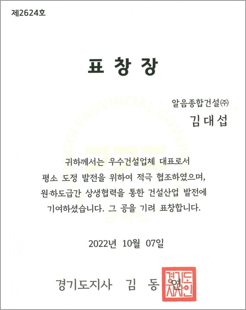 경기도지사 표창장 페이지 정보 작성자 알음종합건설 댓글 0건 조회 395회 작성일 23-11-03 16:25 목록 본문 20221007 이전글국토교통부장관 표창장 24.06.28 다음글노원구청장 표창장 23.11.03