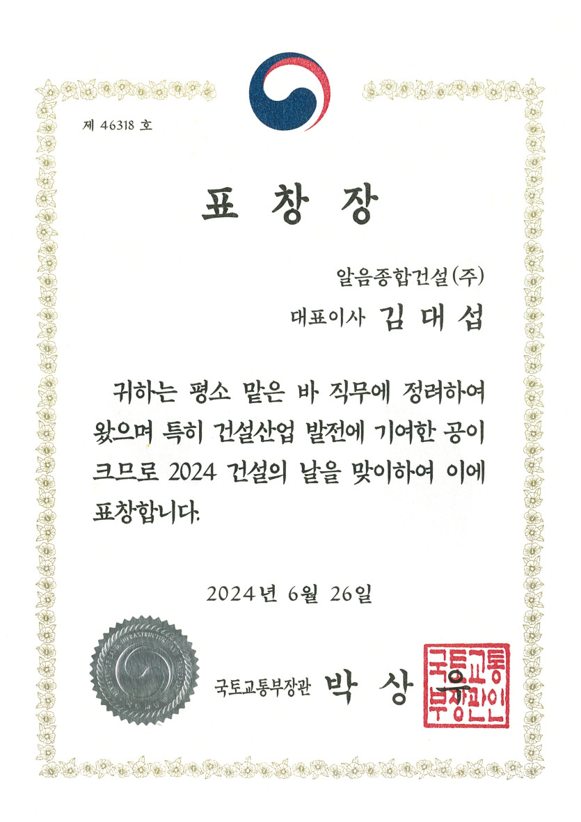 국토교통부장관 표창장 페이지 정보 작성자 알음종합건설 댓글 0건 조회 356회 작성일 24-06-28 17:43 목록 본문 국토교통부장관 표창장 다음글경기도지사 표창장 23.11.03